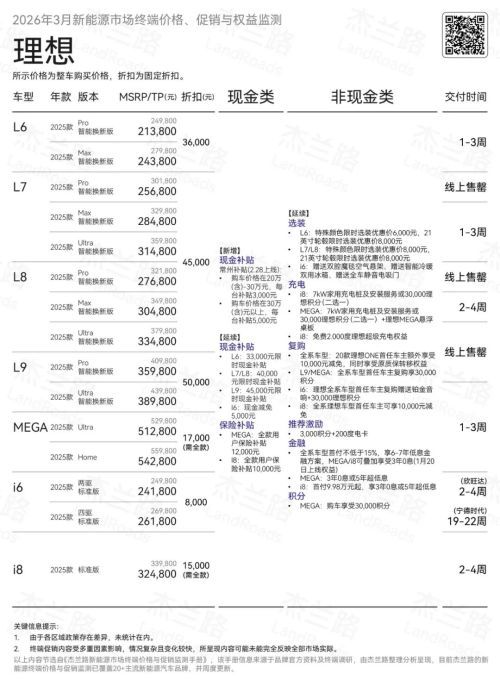 ② 继续大幅降价清老款车型:为了迎接二季度开启的新车大周期(如全新L9),理想在一季度不仅针对老款L系列加码了购车补贴以加速清库;同时,面对纯电市场尤其是纯电(尤其i8)较大的去化压力,公司也开始释放终端折扣。增程与纯电双线降价,进一步拖累了整体ASP。