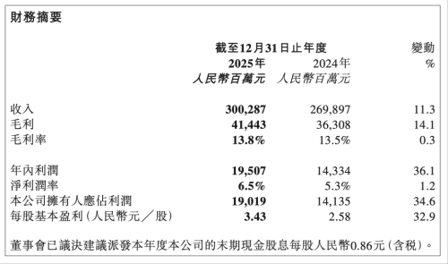 2025年,奇瑞汽车实现总营收3002.9亿元,同比增长11.3%,这是奇瑞汽车首次突破3000亿元营收大关。同期公司拥有人应占利润190.2亿元,同比增长34.6%;公司净利润率也从5.3%提升至6.5%。