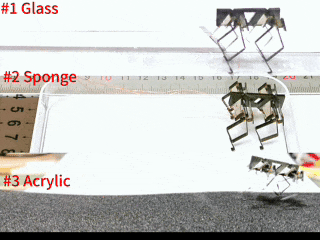 团队先测试了它在不同粗糙度表面上的表现。玻璃、亚克力、海绵。表面越光滑,打滑越严重,速度越慢。