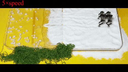 最深度的测试是沙地+10°斜坡+浅水无缝过渡,在沙地易陷、斜坡易滑、浅水易飘的境况下,PLioBot三种地形一次性通过。