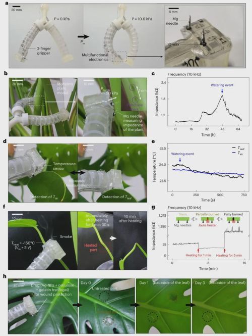 它甚至还能扮演“园丁”的角色。利用指尖的焦耳加热器,它可以对细小的植物茎进行精确“修剪”;之后,再通过药物释放装置,在“伤口”处涂抹含有抗菌银颗粒的药物,保护植物免受感染。