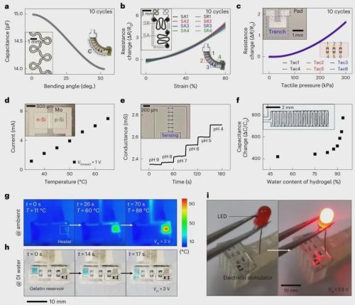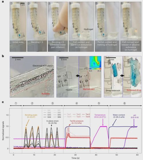 此外,这个系统不只是被动地“感知”,还能主动地“干预”。研究团队还集成了镁焦耳加热器、电刺激器和可控药物释放装置。这些功能模块,让机器人可以执行加热、电疗、伤口处理、害虫防治等多种复杂任务。