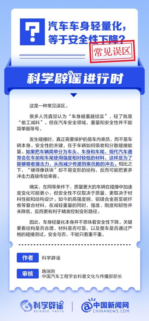 很多人凭直觉认为“车身越重越结实”,轻了就是“偷工减料”。但在汽车安全领域,重量和安全性并不能简单画等号。车身轻量化本身并不意味着安全性下降。安全与否,关键要看结构是否合理、材料是否可靠,以及整车是否通过严格的碰撞测试。(来源:@科学辟谣 中国新闻网微博)