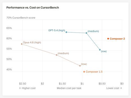 定价 $0.50 / $2.50(每百万输入 / 输出 tokens),对比 Claude Opus 4.6 的 $5 / $25 和 GPT-5.4 的 $2.5 / $15,差距一目了然。Cursor 的解释是,Composer 2 从一开始就专为长时程编码任务设计,结合自研 RL 训练和"self-summarization"技术,把速度和成本同时压下来——他们的说法是"前沿智能 + 极致速度"。