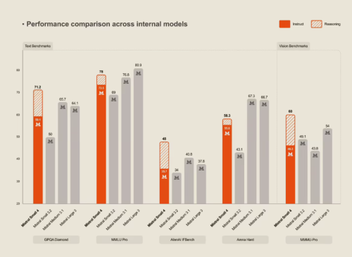 在性能表现上,Mistral Small4 较前代产品实现了质的飞跃。官方数据显示,在延迟优化模式下,其端到端完成时间缩短了40%;而在吞吐优化模式下,每秒处理的请求数量是 Small3的3倍。在与外部大模型的横向评测中,其在三大核心基准测试中的表现均不逊色于 OpenAI 的 GPT-OSS120B。