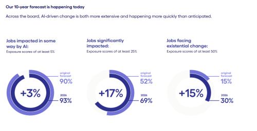 2023年时,该公司基于对美国劳工部职业数据中18000项任务和近1000个职位的分析,预测到2032年将有90%的岗位受到冲击,但现在受到影响的岗位比例就已经达到93%。