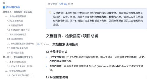 在文档整理场景中,记者通过提示词,让飞书aily生成了一套适配财经新闻报道的全量资料归档文档。该文档搭建了完整的多层级标准化内容框架,可以全局搜索、标签检索、关键词索引三类使用方式,并根据资料文件内容,对信息进行了分类。最终,耗时10分钟,飞书aily设计了符合要求的云文档,过程中无需代码基础,纯自然语言即可完成操作。
