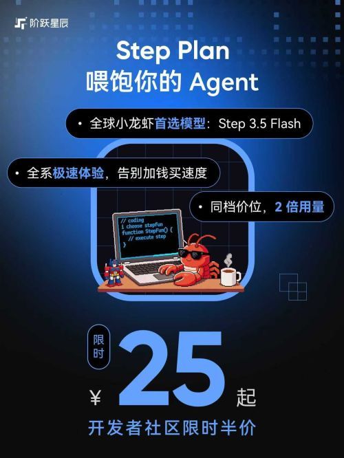 随着 OpenClaw 等 Agent 产品形态的爆发,开发者正面临巨大的成本挑战。阶跃星辰推出的 Step Plan 设置 4 个不同档位方案:Flash Mini、Flash Plus、Flash Pro、Flash Max。起步价 49 元/月,开发者社区限时半价低至 25 元/月。值得关注的是,Step Plan 全档位统一提供高速推理速度,不设"普通版"和"极速版"的区分。在不少同类产品将高速推理作为付费升级项的行业背景下,阶跃星辰选择把极速体验做成标配,让所有用户开箱即享。