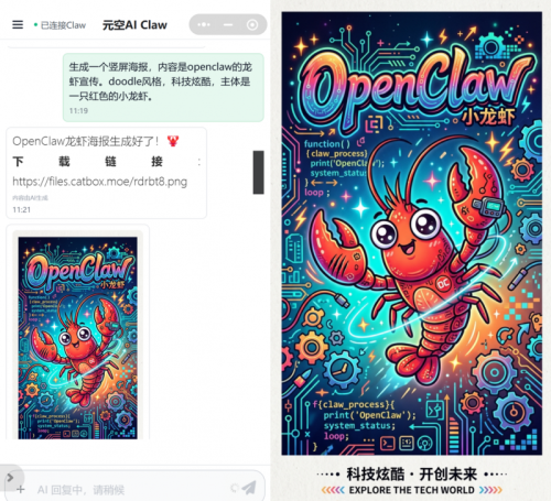 视觉内容创作方面,元空AI Claw集成多模型AI图片生成能力,默认采用混合模型驱动,兼顾生成速度与画面质感,同时支持风格迁移、图文生成等多种灵活模式。用户无需具备专业设计功底,只需输入简单文字指令,即可快速生成文章封面、商业插画、个性化头像等高质量视觉内容,轻松满足办公宣传、个人创作、品牌推广等多元化创意需求,让每一份作品都更具质感与竞争力。