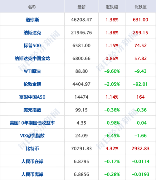 美股三大指数集体收涨,道琼斯指数涨1.38%,标普500指数涨1.15%,纳斯达克综合指数涨1.38%。科技股普涨,博通涨超4%,甲骨文、特斯拉涨超3%,亚马逊涨超2%,英伟达、Meta、奈飞、苹果涨超1%。存储概念股走低,美光科技跌超4%,希捷、闪迪跌超1%。热门中概股收盘多数上涨,纳斯达克中国金龙指数收涨0.86%,小鹏汽车涨7.5%,蔚来涨7%,老虎证券、富途控股收涨超3%,阿里巴巴涨3%,理想汽车涨超2%,腾讯控股ADR、爱奇艺、微博涨超1%。
