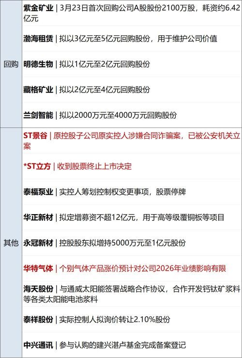 中国银行(SH601988,股价5.39元,市值17367亿元):3月23日,中国银行发布关于加强贵金属市场风险防范的提示。近期,全球地缘政治风险加剧,在多重因素影响下,国内外贵金属价格波动进一步加大。中行特别提示各位客户做好市场风险防范,基于自身财务状况和风险承受能力开展理性投资,合理控制贵金属仓位,并通过长期投资降低阶段性价格波动影响,防范市场波动带来的资金损失风险。