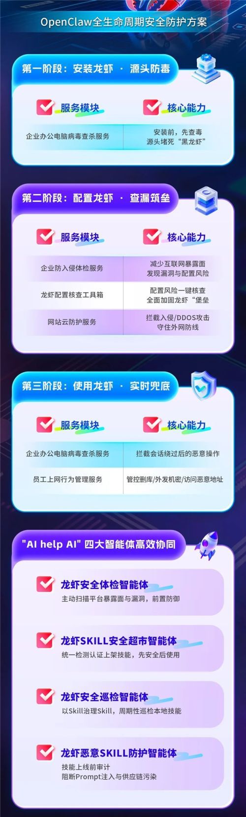 凭借“安装查毒-配置筑垒-使用兜底”的全生命周期实战化防护服务,360安全云龙虾保为OpenClaw这位强大但易失控的“大力士”制定了行为准则,明确了行为底线,让企业在享受其强大能力的同时,也能够“管得住”风险,安心释放AI生产力。