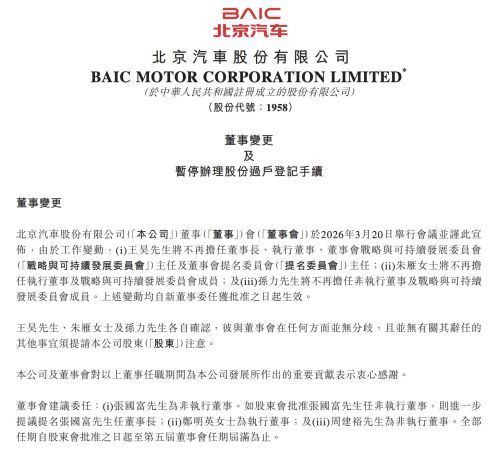 北京汽车在上述公告中称,由于工作变动,王昊将不再担任董事长、执行董事、董事会战略与可持续发展委员会主任及董事会提名委员会主任;朱雁将不再担任执行董事及战略与可持续发展委员会成员;孙力将不再担任非执行董事及战略与可持续发展委员会成员。上述变动均自新董事委任获批准之日起生效。
