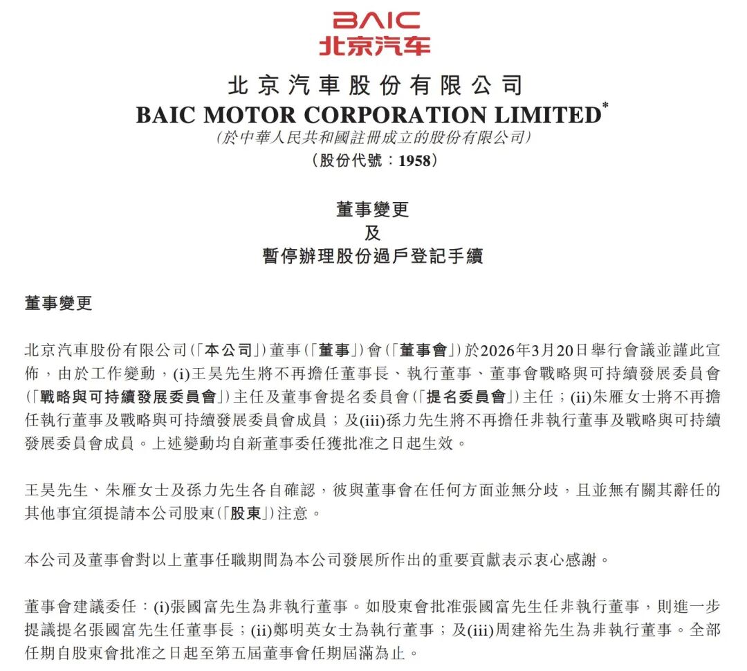北京汽车在上述公告中称,由于工作变动,王昊将不再担任董事长、执行董事、董事会战略与可持续发展委员会主任及董事会提名委员会主任;朱雁将不再担任执行董事及战略与可持续发展委员会成员;孙力将不再担任非执行董事及战略与可持续发展委员会成员。上述变动均自新董事委任获批准之日起生效。