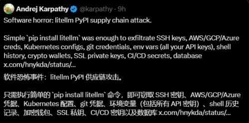 3月24日,AI 开源生态突发重大安全事件。知名 Python 库 litellm 在 PyPI 平台被植入恶意代码,构成一次典型的供应链攻击。攻击无需主动调用,只要安装该库即可触发,影响范围极广。