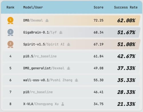 排行榜中新增的完成时间(Time to Complete)评分维度,则赋予了这一升级更深的战略意义。它倒逼研究者在追求成功率的同时,优化策略的实际执行效率——一个需要30秒推理才能完成一次抓取的模型,在真实部署场景中毫无价值可言。这一指标的加入,让评测结果与真实落地需求之间的对齐度大幅提升。
