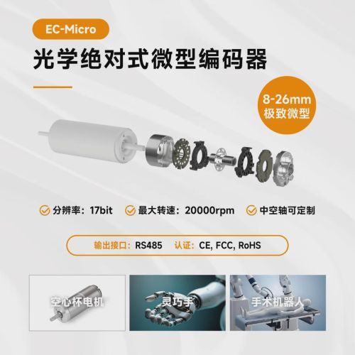 在精密运动控制领域,空心杯电机凭借低惯量、高动态、高效率、无齿槽效应等优势,已成为医疗设备、机器人灵巧手、微型伺服系统的核心动力单元。而作为决定控制精度的关键部件,微型编码器长期是制约整机性能的关键瓶颈——市场上长久以来缺少一款小体积、绝对式、光学、无磁、高速、可定制的编码器。