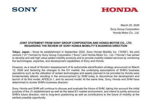 双方在联合声明中表示,由于本田对其电动化战略进行了重新评估,原定的商业计划已不再可行。索尼预计,鉴于索尼本田移动出行公司所采取的“轻资产”运营模式,此次变动不会对其财务状况产生实质性影响。
