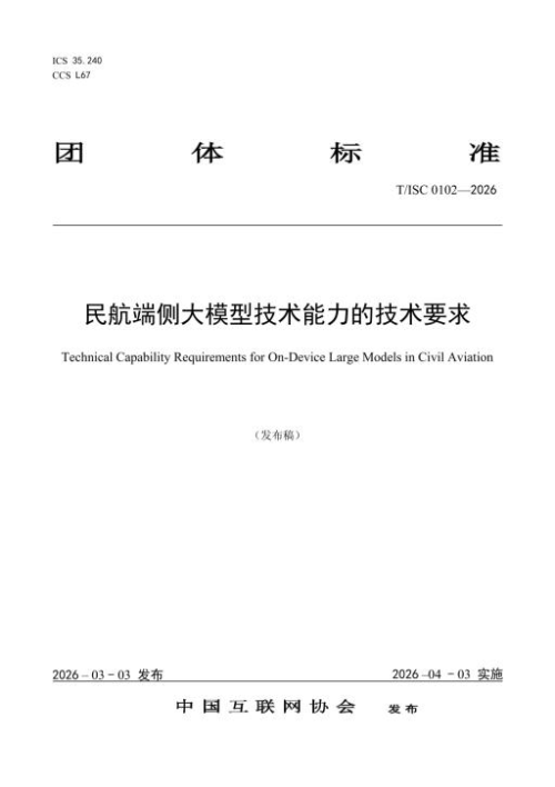 近日,中国互联网协会正式发布《民航端侧大模型技术能力的技术要求》(T/ISC 0102-2026)团体标准,该标准作为国内首个聚焦民航端侧大模型的规范文件,由南航数科、中国信通院、浩鲸科技、南京航空航天大学等单位共同牵头起草。