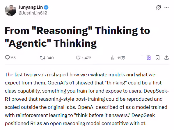 前阿里千问技术负责人林俊旸离职后发表长文,明确指出 AI 大模型的发展路线正在经历重大跨越,核心竞争焦点正从“推理型思考(Reasoning Thinking)”全面转向“智能体思考(Agentic Thinking)”。