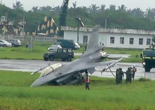 2021年,台湾屏东机场一架F-16战机在“汉光”演习预演时滑出跑道。图源:台媒