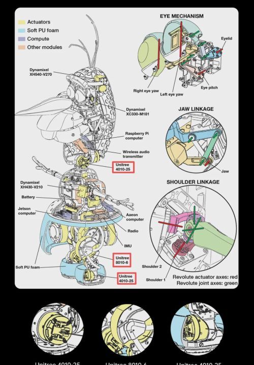 在头部控制方面,由于“大头细颈”的结构特点,颈部电机需要在狭小空间内同时满足扭矩输出与响应速度的要求。宇树4010-25电机被用于该部位,其精准响应确保了雪宝表情的实时性与生动感。