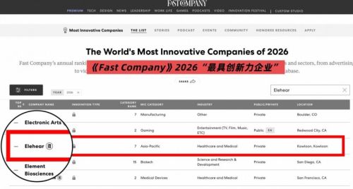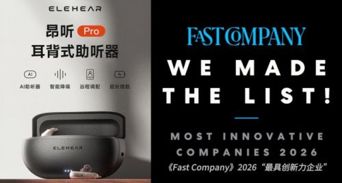 3月25日,全球权威商业媒体《Fast Company》正式发布"2026年全球最具创新力企业"榜单,昂听ELEHEAR成功入选,位列亚太地区最具创新力企业第7位。本年度评选中,昂听ELEHEAR是全球唯一一家上榜的助听器企业,凸显了中国听力科技品牌在全球市场的知名度和影响力。