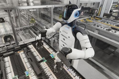 技术上,AEON搭载22个工业级传感器与高清摄像头,可实现毫米级定位与装配精度,能够根据工序需求自主更换夹具,并具备动态避障能力。在移动方案上,AEON未采用纯双足结构,而是使用轮足混合设计,在保证灵活性的同时提升移动效率。
