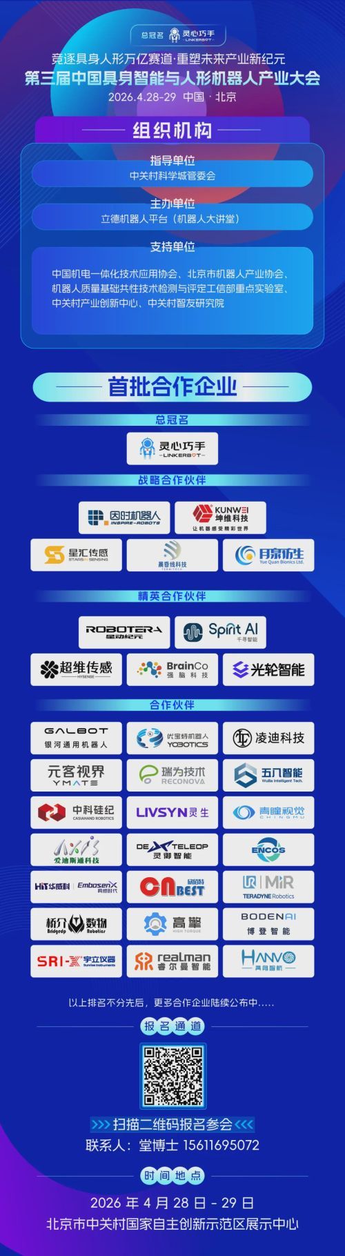 第三届中国具身智能与人形机器人产业大会定档2026年4月28日-29日,随着势能全面集结,多位行业领袖、院士学者将现场分享前沿思想、洞察产业方向,产业领军企业将同步展示新品、深度交流对接。