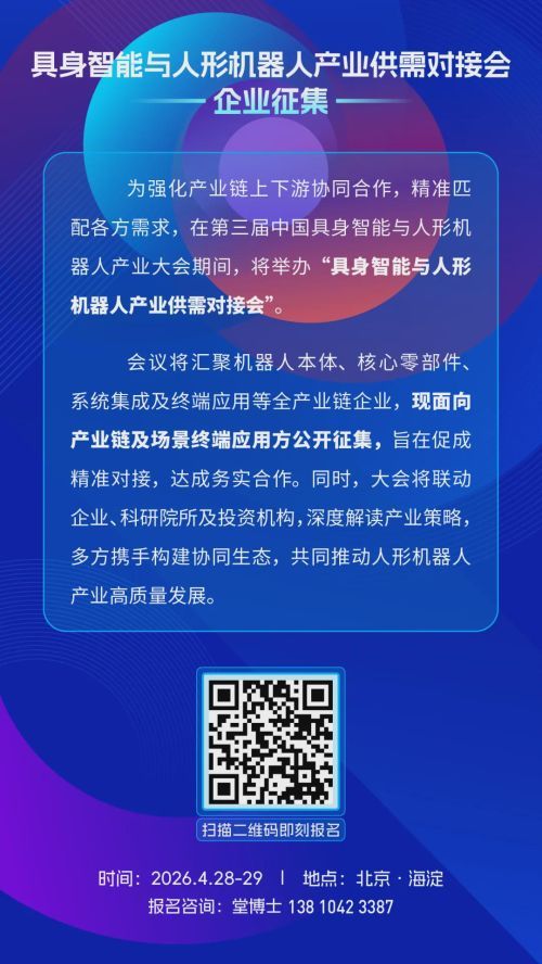 大会特设【具身智能与人形机器人产业供需对接会】,推动机器人场景、本体、零部件企业三方同台对话,精准对接,达成务实合作。现企业征集正在进行中: