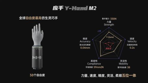 其中,应手Y-Hand M2依托任雷教授国际首创的仿生拉压体机器人理论与技术,颠覆传统刚性铰链设计,以38个自由度的灵活表现,实现力量、速度、精度、柔顺性与灵活性五大维度的协同突破。应手Y-Hand M2整手握力达330N、指尖力达180N、五指闭合仅需0.2秒、单指指尖重复定位精度达0.04mm、手指挠度达59mm/N,其灵动自如的手指动作,既能适配高端精密装配场景,也能满足柔性操作需求,让现场嘉宾直观感受仿生拉压体机器人理论与技术带来的颠覆性突破。
