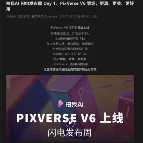 3月31日,爱诗科技(AIsphere) 正式开启“闪电发布周”,并于首日重磅发布了全新升级的视频生成大模型 PixVerse V6。该版本在人物真实感、物理模拟及叙事连贯性上实现全面突破,标志着 AI 视频正从生成画面走向“构建世界”。