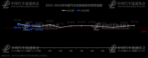 2026年3月31日,中国汽车流通协会发布的最新一期“中国汽车经销商库存预警指数调查”VIA(Vehicle Inventory Alert Index)显示,2026年3月中国汽车经销商库存预警指数为57.5%,同比上升2.9个百分点,环比上升1.3个百分点,库存预警指数位于荣枯线之上。