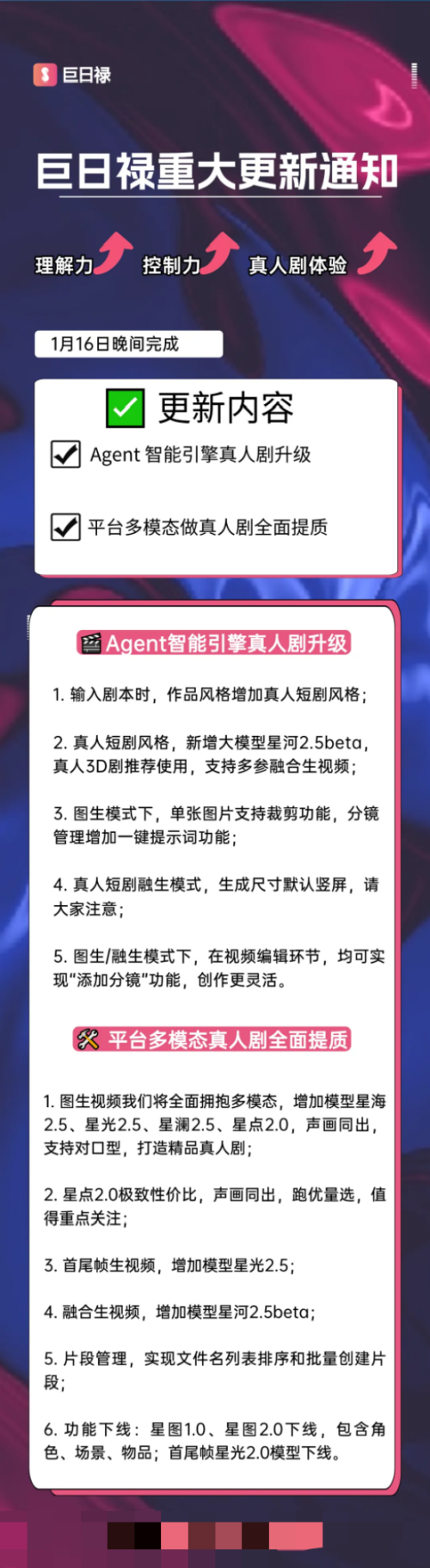 巨日禄于1月16日深夜完成了升级,多款真人专属新模型重磅上线,彻底升级AI真人剧创作体验!所有模型均实现声画同出、精准对口型的核心突破,从全场景适配到功能专攻,既解决了以往真人剧创作声画脱节、精品难成的痛点,更让专业级内容创作无需高成本投入,轻松实现高效产出、精品落地,让每一位伙伴都能低成本打造高质量真人剧!