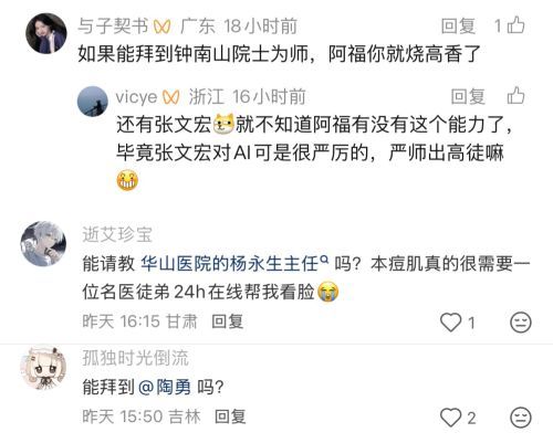 拜师帖一经发出,便引发热烈讨论。还有不少网友在评论区艾特各大知名专家收徒。有医学生发帖调侃:“卷完科研卷临床,这下连 AI 都来卷我们了”。