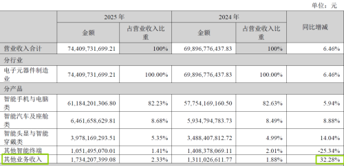 据最新财报显示,2025年公司总营收为744.1亿元,同比增长6.46%,其中,蓝思科技没有单独给出具身智能业务的营收情况,但是其他业务收入为17.34亿元,同比增长32.28%,相比于去年的收入占比来说,直接提升了0.45%。