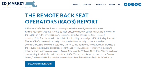 Markey周二批评称,自动驾驶汽车公司长期以来一直吹嘘他们可以消除人为失误造成的道路交通事故,但实际上他们承认其技术仍需要依赖人类的帮助。