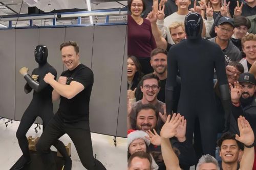 从细节来看,Optimus V3的类人化设计体现在方方面面:脚踝处能看到类似布料的自然褶皱,站姿并非僵硬的笔直状态,而是带着自然的放松感,甚至能观察到细微的重心动态变化。这种贴近真人的肢体状态,是前代伺服电机技术难以模拟、过往产品从未实现的 “人味”,而这款真机的外形,也与今年1月中旬马斯克合影时,被外界误认成“皮套人”的机型几乎完全一致。
