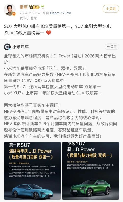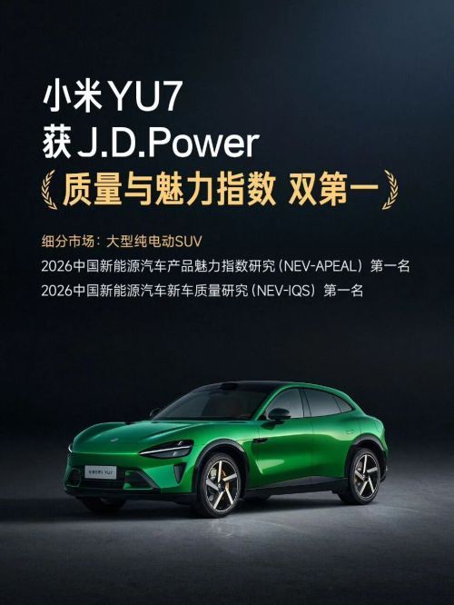 J.D. Power发布2026中国新能源汽车新车质量研究报告。小米汽车旗下第一代小米SU7以193个PP100的数值,夺得大型纯电动轿车品类第一名,并连续两年包揽该细分市场的质量与魅力双项冠军。