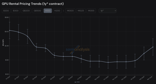 据半导体研究机构SemiAnalysis周四推出的“H100一年期租赁合约价格指数”,这款“老芯片”的租赁合约价格从2025年10月触及每小时1.7美元后,已经在今年3月飙升至每小时每块GPU 2.35美元,飙升近40%。