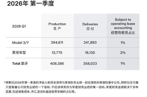 Model 3和Model Y仍是特斯拉生产和交付的主力车型,二者整体贡献度超过95%。一季度,这两款车的总产量为39.46万辆,交付量为34.18万辆,较2025年同期增长约5.6%,但较2025年第四季度(41.8万辆)下降约15.9%。包括Model S、Model X等在内的其他车型一季度产量为1.37万辆,交付量为1.61万辆。