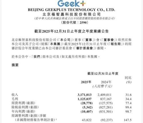 2025年,极智嘉年内亏损1040.7万元,大幅收窄98.75%;经调整净利润4382万元,首次实现年度盈利;公司整体毛利率提升0.7个百分点至35.5%。经营亏损大幅收窄,一方面来源于规模效应显现,供应链成本优化;另一方面,极智嘉来自海外市场的收入占比达到75.3%,而这部分业务毛利率高达46.6%。