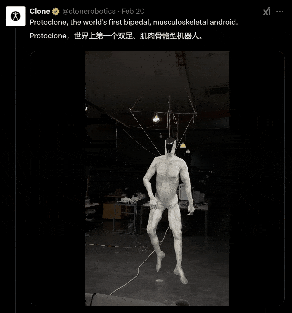 2025年2月,他们第一次把全身拼起来,就是那个被挂在天花板上的Protoclone。它有了完整的腿,能活动髋、膝、踝关节。但因为还站不起来,只能被吊着,双腿在空中乱踢。但因为视觉效果过于惊悚,视频意外走红,全网都在转发热议。