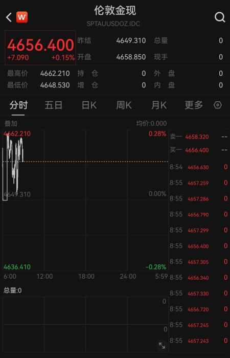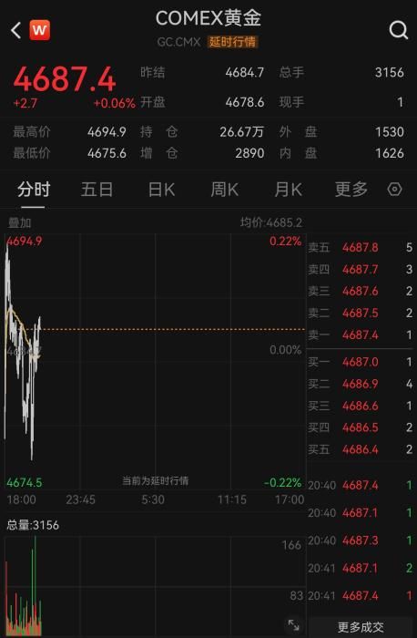 黄金在连续两日下跌后趋于平稳。截至北京时间4月7日8时55分,COMEX黄金期货涨0.06%,报4687.4美元/盎司;伦敦现货黄金上涨0.15%,报4656.4美元/盎司,昨日盘中伦敦现货黄金曾一度突破4700美元/盎司,日内涨幅达0.66%。