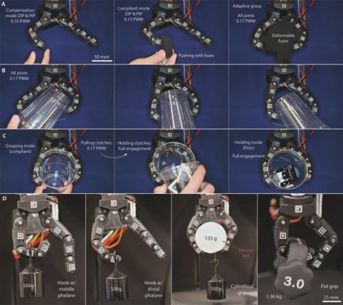 他们还测试了不同表面摩擦力下的抓取能力。光滑表面无法承受0.5公斤的重量,但加上硅胶高摩擦层后,能稳定抓取0.635公斤。如果两个手指形成握拳姿态,负载能力进一步提升到1.36公斤。