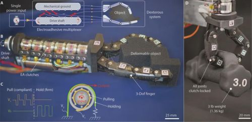 近日,机器人学领域权威期刊《npj Robotics》 上发表了一项有趣的研究。来自美国西北大学的国际研究团队给出了一套让人眼前一亮的方案,他们用绞盘式放大的电粘附离合器,让单个电机通过可寻址的离合器同时驱动多个关节,力的大小跨越了三个数量级。