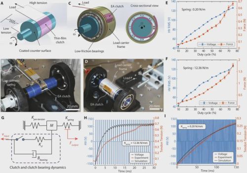 通过高压脉宽调制(PWM)来控制离合器,他们实现了亚牛顿级(<0.1 N)的力分辨率。实验数据显示,调节占空比(0-100%),输出力可以从几乎0平滑上升到数牛顿。而且离合器开关频率接近1 kHz的毫秒级响应,这意味着可以高速地调制力,实现柔顺交互。