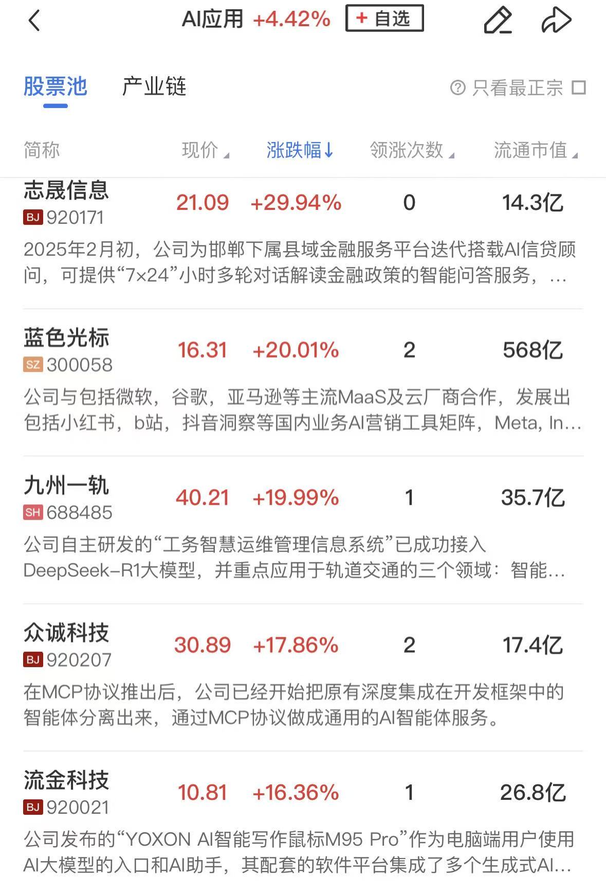 AI应用涨幅居前,蓝色光标、利欧股份、电广传媒、浙文互联、引力传媒、 天地在线等涨停。