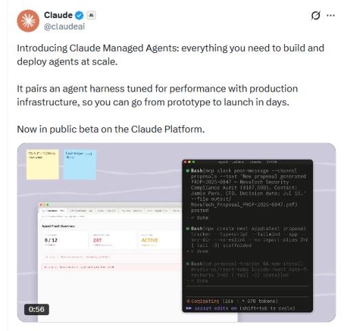 据官方推文介绍,Claude Managed Agents 是专为构建和大规模部署 AI 代理而设计的一站式解决方案。它将性能优化的代理框架与生产级基础设施完美结合,帮助开发者大幅缩短开发周期。