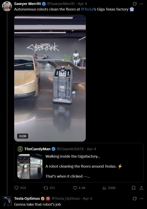 最近,Tesla Optimus官方账号在X平台上发布了一条极具象征意义的推文:针对Giga Texas工厂内一台正在自主清洁地板的商用机器人,它幽默回应道“Gonna take that robot’s job”(我要抢这个机器人的工作了!)。这一看似调侃的发言,迅速点燃了全球科技爱好者的讨论。